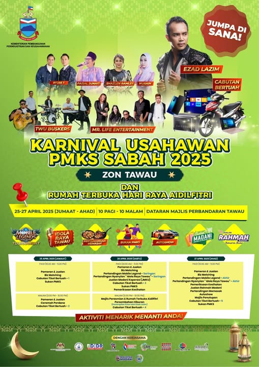 Karnival Usahawan PMKS Zon Tawau 2025 telah berlangsung di Dataran Majlis Perbandaran Tawau pada 25 hingga 27 April 2025. Karnival ini, yang diselenggarakan secara bersama-sama dengan Rumah Terbuka Hari Raya Aidilfitri, menawarkan pelbagai aktiviti untuk seisi keluarga, termasuk hiburan, cabutan bertuah, persembahan artis, dan peluang perniagaan.ย